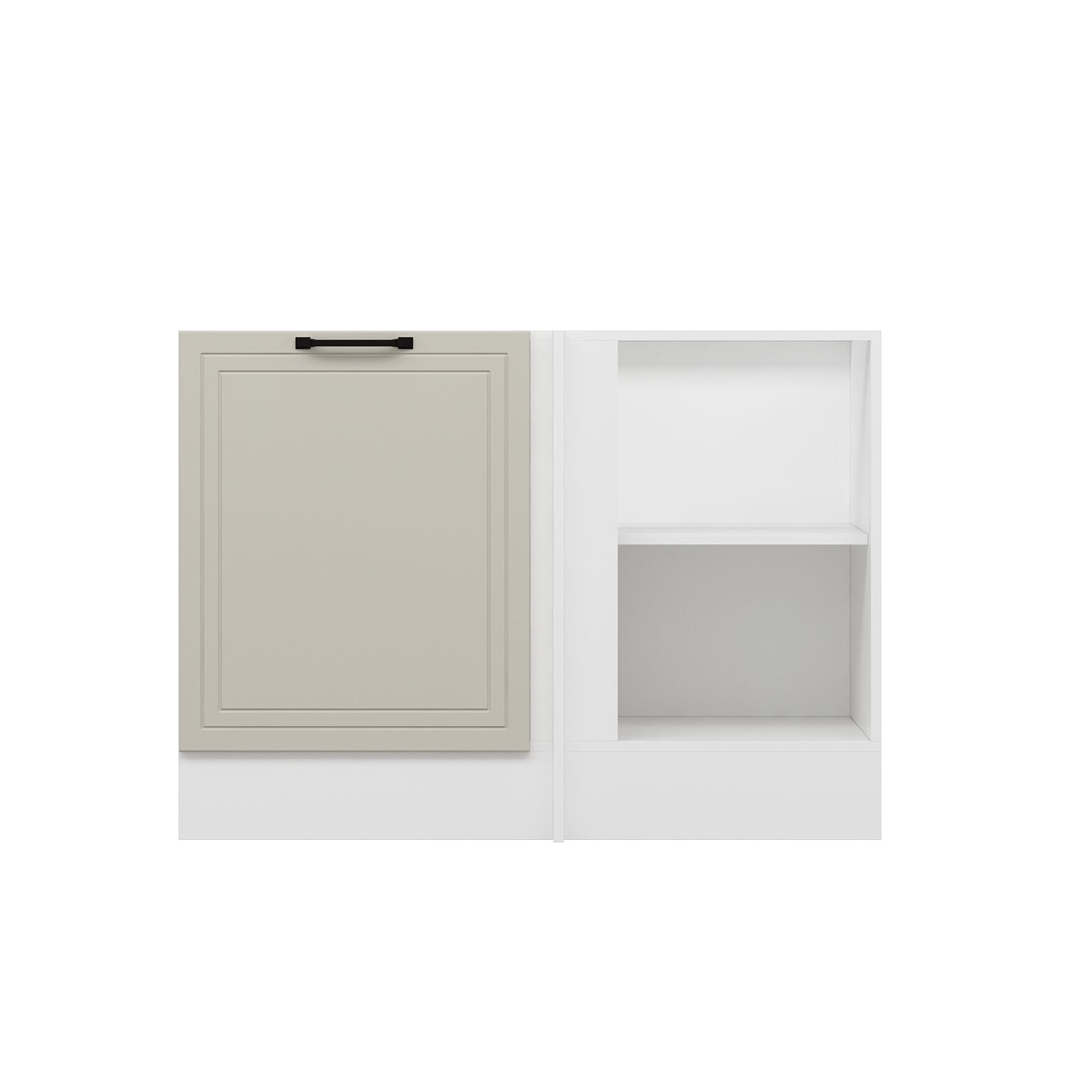 Köşe alt mutfak dolabı, mutfakta genellikle atıl kalan köşe alanlarını verimli şekilde değerlendirmek için tasarlanmıştır. Tezgâh altına uyumlu formu sayesinde köşe noktalarında maksimum depolama alanı sunar. Tencere, tava ve büyük mutfak gereçlerini düzenli biçimde saklamaya yardımcı olarak mutfakta kullanım kolaylığı sağlar.
