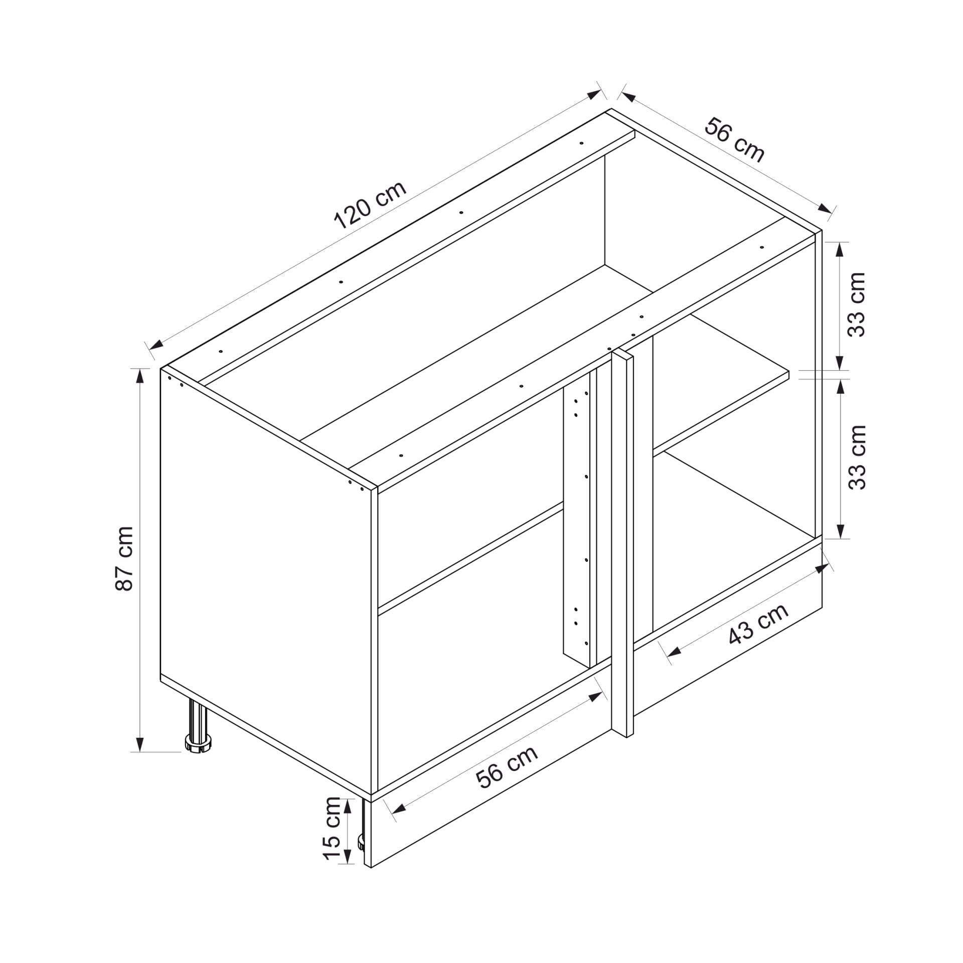 120 cm Genişlik: Geniş köşe yapısıyla mutfakta maksimum depolama kapasitesi ve kullanım rahatlığı sağlar.